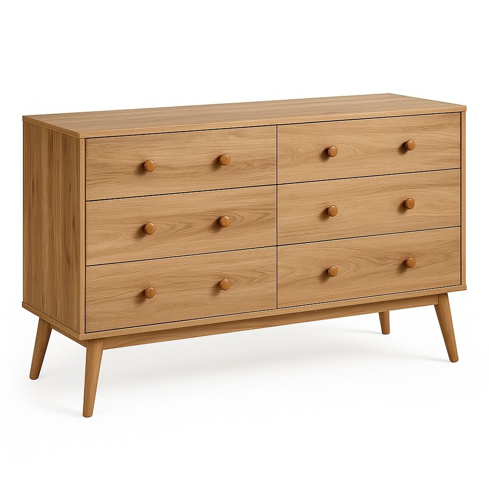 Cómoda de madera chapada en roble, 80×120×40 cm, con 6 cajones, color natural
