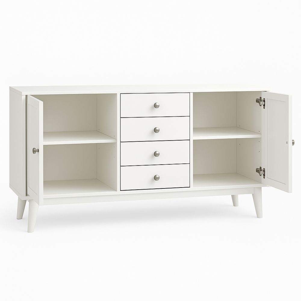 Aparador MDF Blanco Herrajes acero inoxidable 4 cajones 2 puertas 140×40×80cm