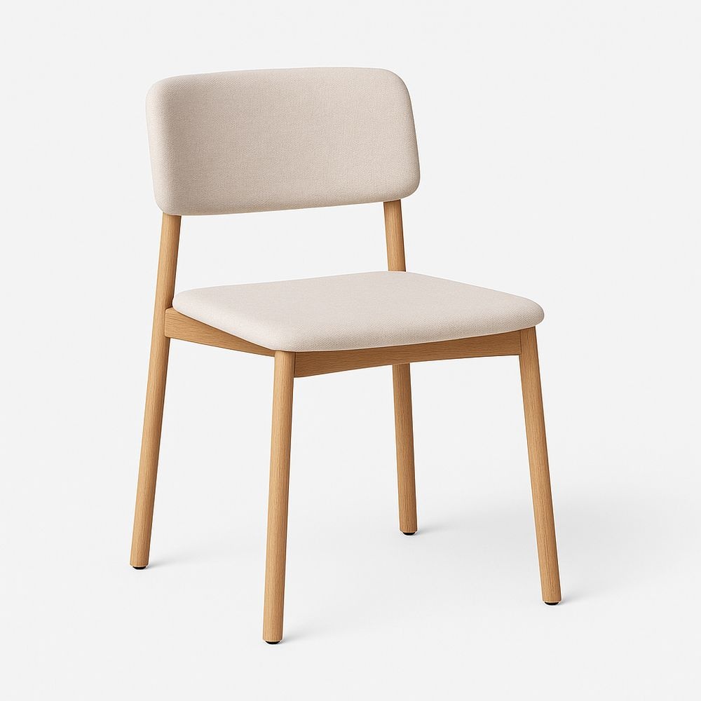 Silla de comedor con estructura de madera y asiento de tela beige, altura 80 cm, ancho 45 cm, profundidad 50 cm