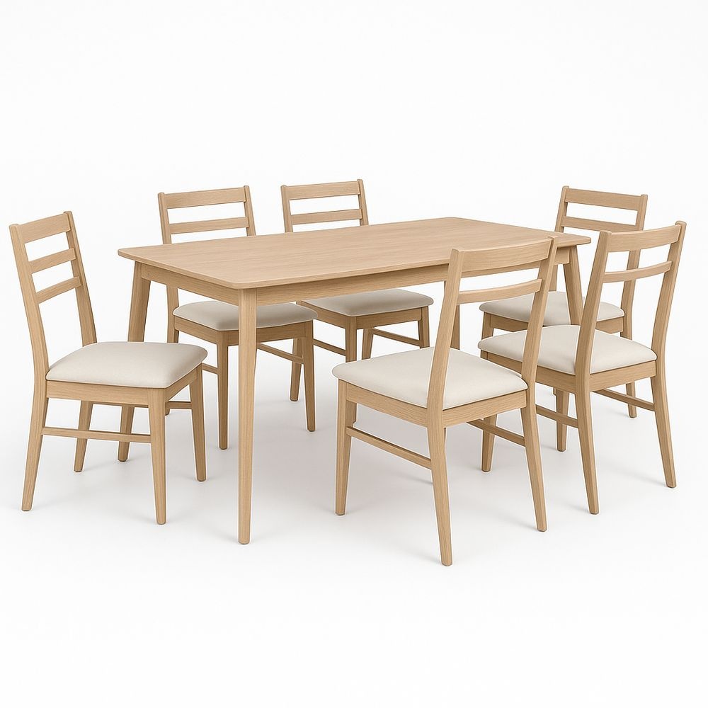 Conjunto mesa y 6 sillas Madera maciza roble Tapizado poliéster Natural 150×90×75cm