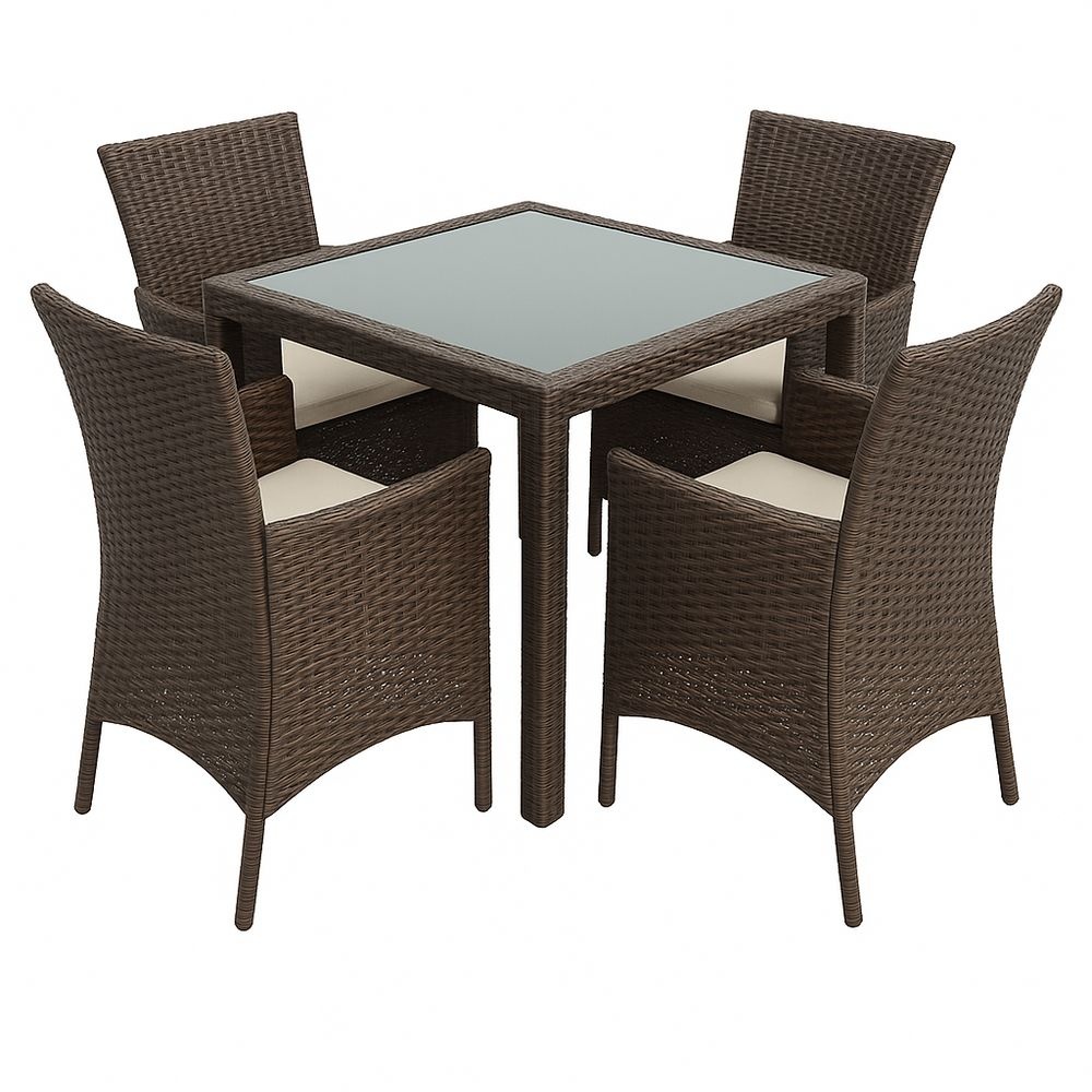 Conjunto de mesa cuadrada de ratán sintético con tablero de vidrio templado y 4 sillas con cojines de poliéster, marrón, 90x90x75 cm