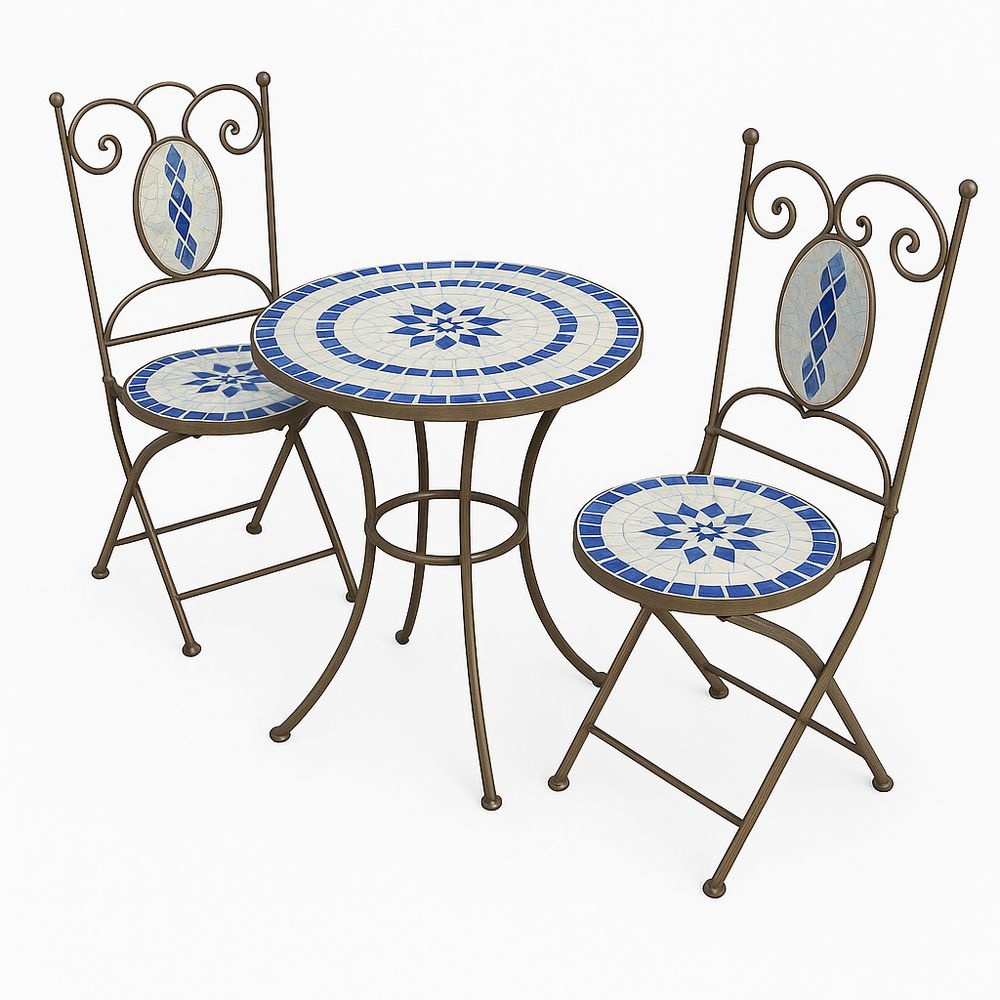 Juego de Muebles de Jardín 3 Piezas de Hierro y Cerámica Mesa Redonda Azul