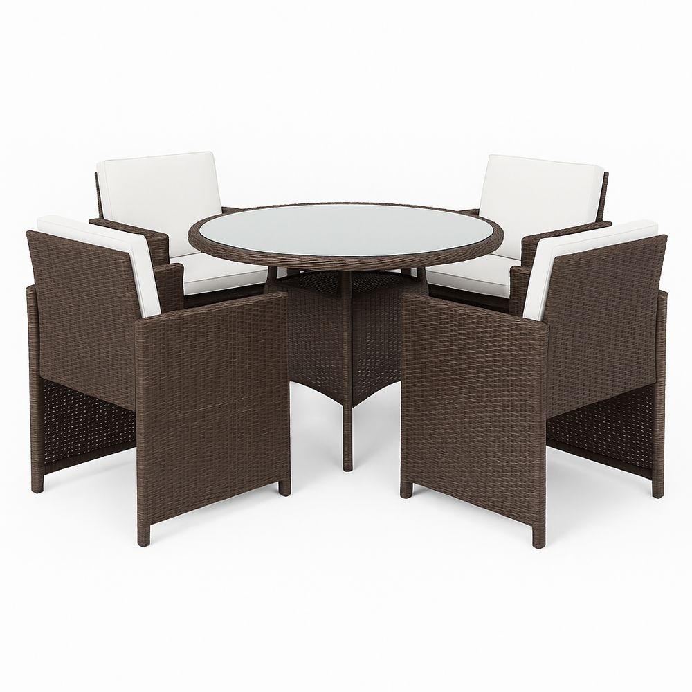Conjunto de Muebles de Exterior de Ratán PE Mesa Redonda Vidrio Templado Marrón/Blanco 5 Piezas