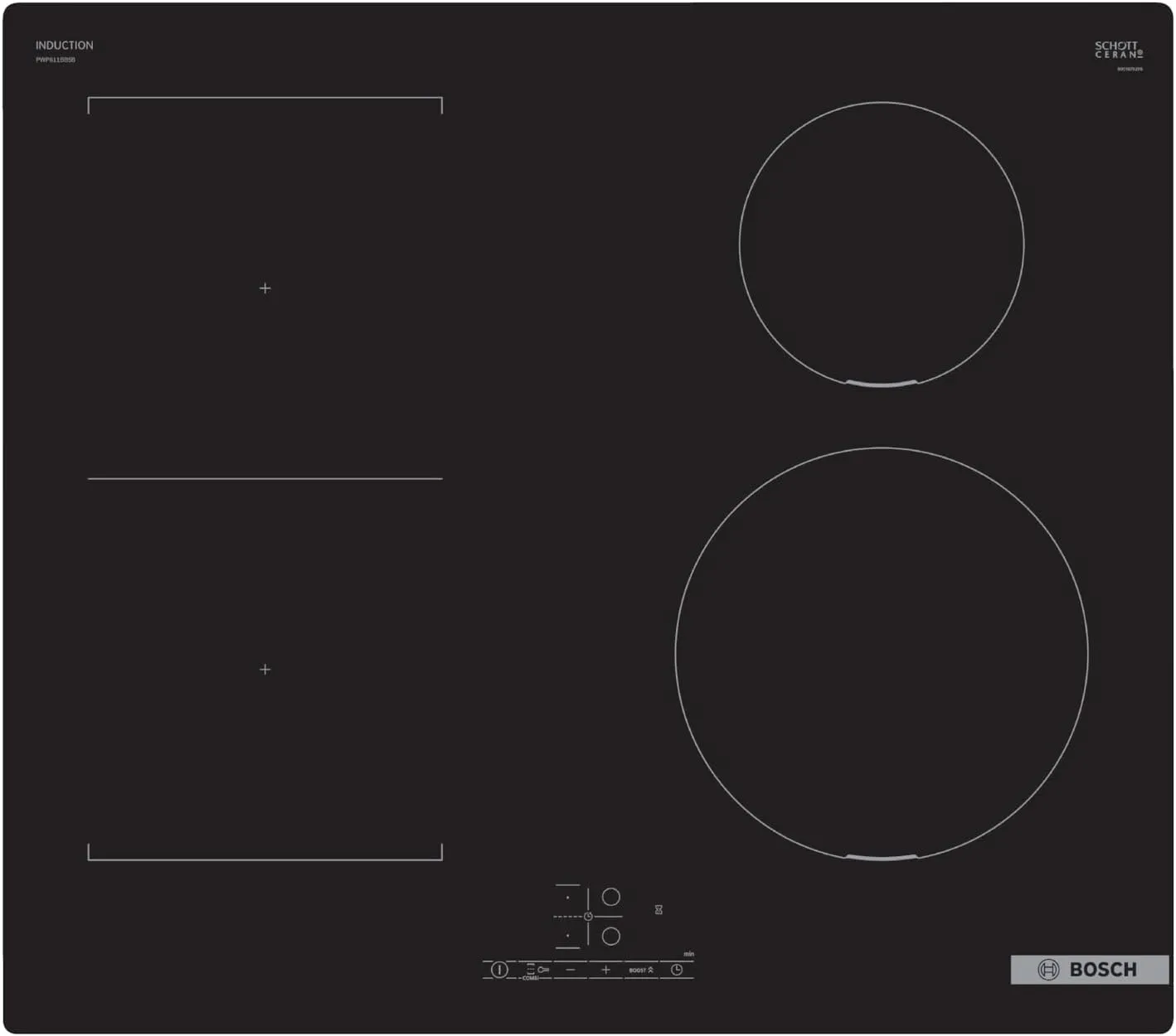 Plaque de inducción Bosch Serie 4 PWP611BB5B con TouchSelect, CombiZone y PowerBoost, color negro, 24" de ancho.